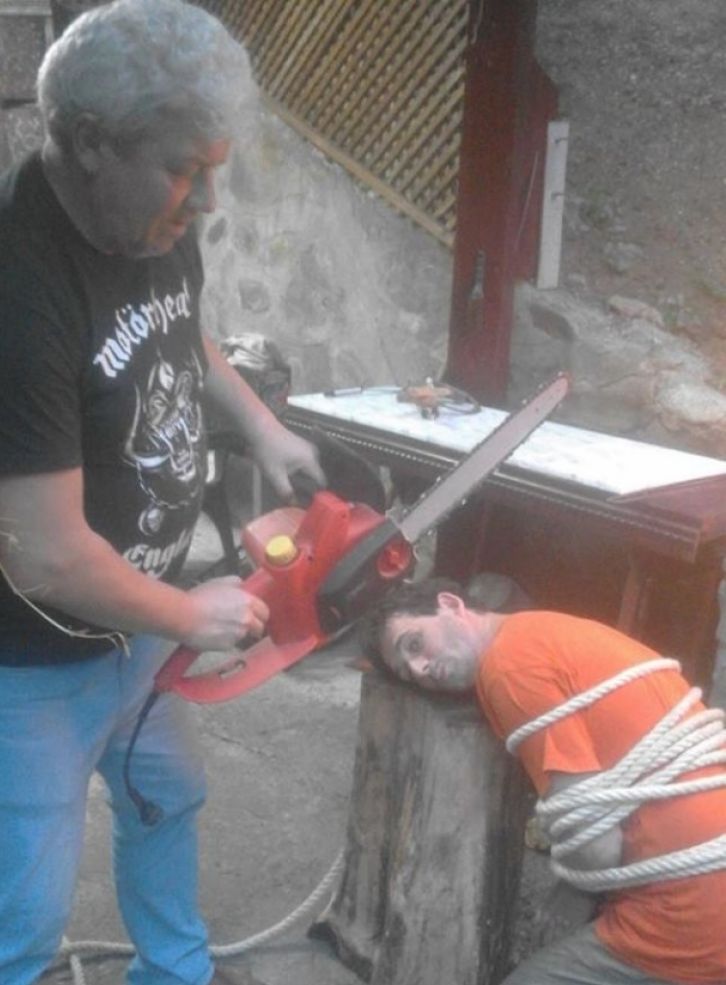 Mihai Bicsi a candidat la alegerile locale, din partea PNL, pentru un post de consilier local la Suceava, dar a devenit celebru dupa ce, acum cateva zile, a postat pe facebook o fotografie halucinanta. Politicianul tinea o drujba deasupra gatului unui barbat ingenuncheat, legat cu o funie si asezat cu capul pe un bustean. “Terorist ISIS capturat la Voronet”, a comentat Bicsi, care a starnit revolta oamenilor, inclusiv pe a sefilor sai de partid, care ii pregatesc excluderea din organizatie.