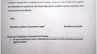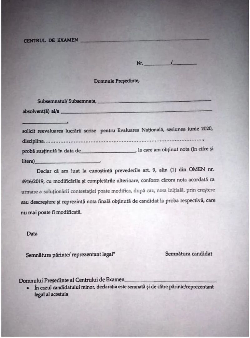 Candidații care vor să depună contestații trebuie să completeze și să semneze o cerere care conține și o declarație-tip, în care elevii menționează faptul că au luat la cunosțință că nota acordată în urma soluționării contestației poate fi mai mică sau mai mare decât nota acordată la prima corectură.