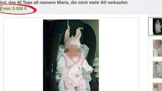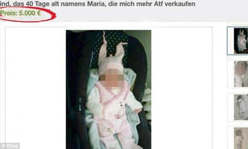 Autoritatile investigheaza cazul unui bebelus care a fost scos la vanzare pe eBay de parintii lui.Anuntul: "copil, 40 de zile pe nume Maria...de vanzare" se pare ca ar fi fost postat din Germania si venea insotit de mai multe poze cu micuta, scrie DailyMail.