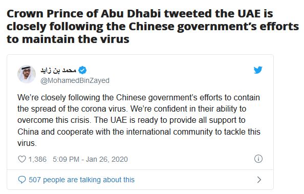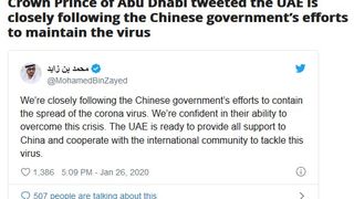"Urmărim îndeaproape eforturile guvernului chinez de a conține răspândirea virusului corona. Suntem încrezători în capacitatea lor de a depăși această criză. Emiratele Arabe Unite este gata să ofere tot sprijinul Chinei și să coopereze cu comunitatea internațională pentru combaterea acestui virus", a scris Mohamed Bin Zayed pe o rețea de socializare.