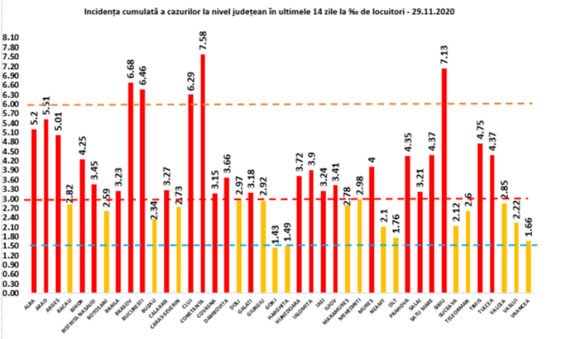 În intervalul 28.11.2020 (10:00) – 29.11.2020 (10:00) au fost raportate 148 de decese (86 bărbați și 62 femei), ale unor pacienți infectați cu noul coronavirus, internați în spitalele Alba, Argeș, Arad, Bacău, Bistrița-Năsăud, Bihor, Botoșani, Călărași, Caraș-Severin, Cluj, Constanța, Dolj, Harghita, Ialomița, Iași, Maramureș, Mehedinți, Mureș, Neamț, Prahova, Sălaj, Sibiu, Suceava, Timiș, Vaslui, Vrancea, Ilfov și Municipiul București.