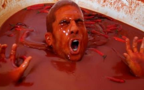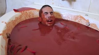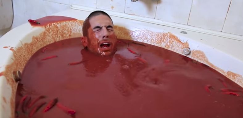 Barbatul s-a aruncat intr-o cada umpluta cu 1200 de sticle de sos de ardei iute si a inregistrat tot momentul. A regretat insa din prima clipa faptul ca a facut asta doar de dragul vizualizarilor.