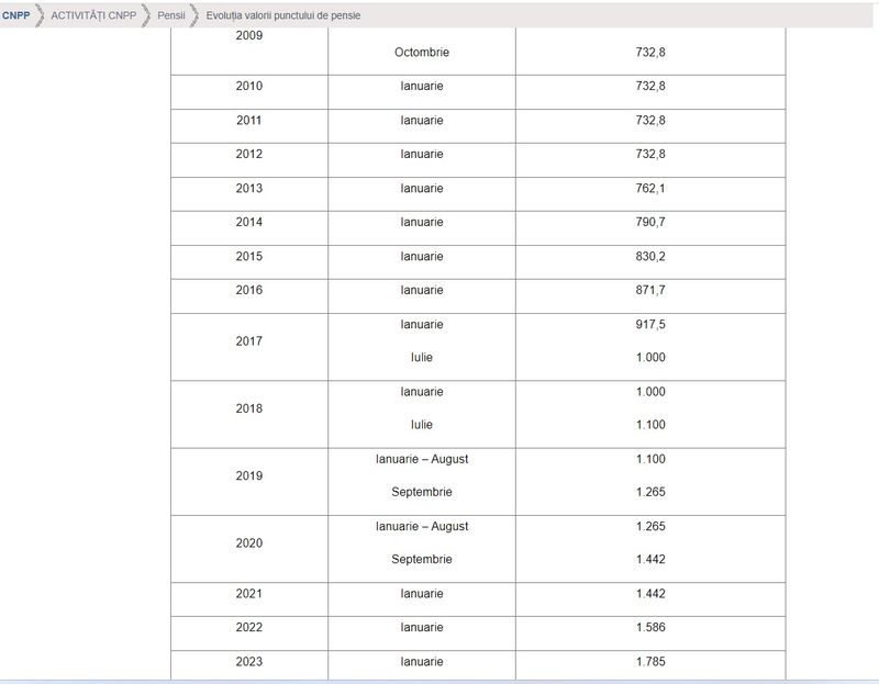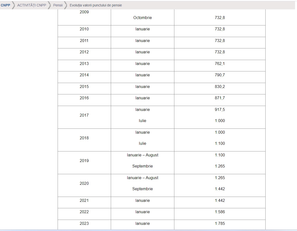 O creștere mai mare a punctului de pensie s-a realizat între anii 2008 și 2009= a fost o creștere de 26% la finalul lui 2009 față de începutul anului 2008