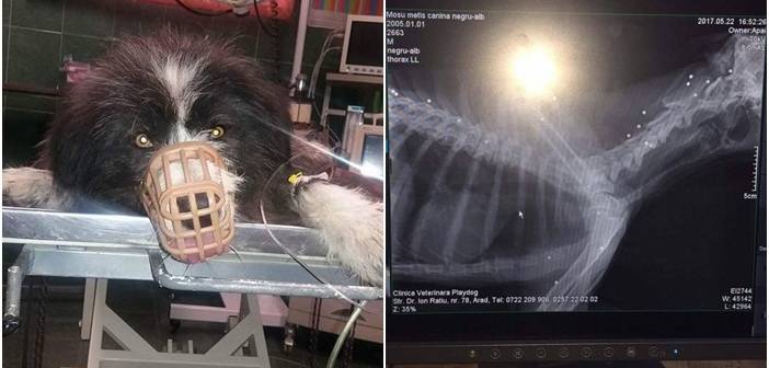 Medicii veterinari din Arad au descoperit ca patrupedul acea 27 de alice in corp. Cineva l-a impuscat de 27 de ori.