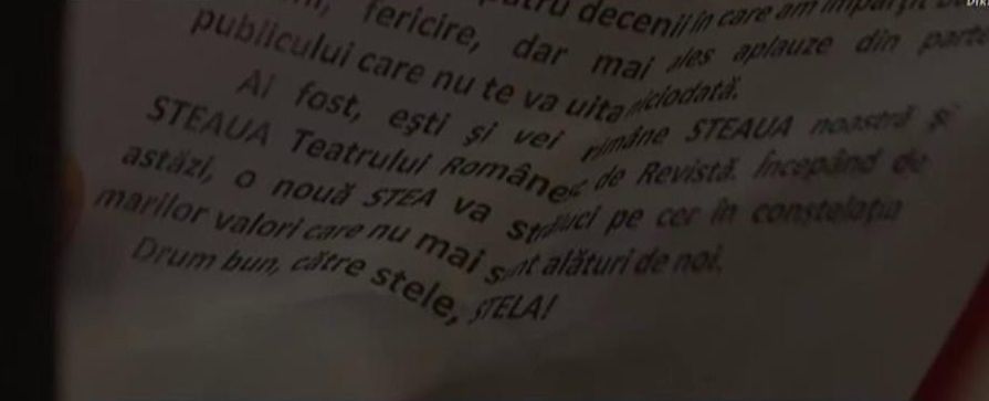 Stela! Stela! Dupa 4 decenii in care am impartit bucurii si lacrimi, dar mai ales aplauze. Ai fost si vei ramane steaua noastra, steaua teatrului romanesc de revista. Incepand de azi, o noua stea va straluci pe cer, in constelatia marilor valori care nu mai sunt alaturi de noi. Drum bun, Stela, catre stele!