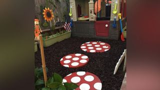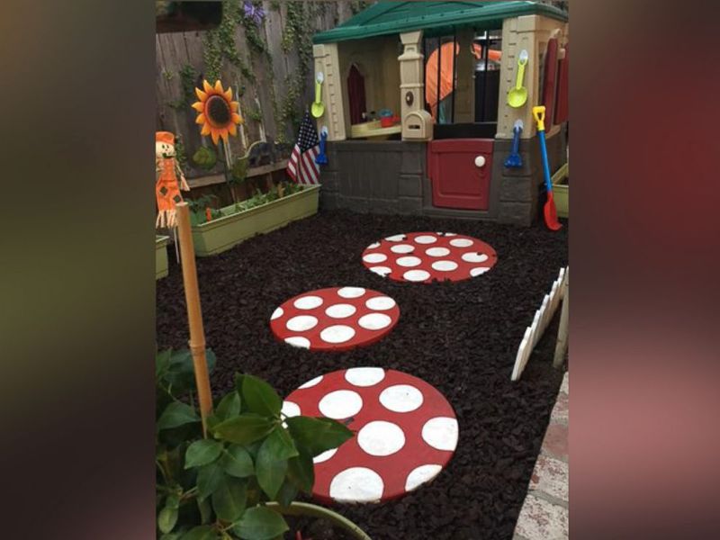 Cei doi soti au vopsit vechile pietre pe care calcau cu vopsea rosie, peste care au pictat buline albe, iar pamantul a fost acoperit cu cauciuc, astfel ca cei mici pot sta desculti la locul de joaca.
