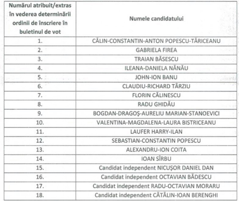 Aceasta este ordinea candidaților pentru Primăria București: 1. Călin-Constantin-Anton Popescu-Tăriceanu; 2. Gabriela Firea; 3. Traian Băsescu; 4.