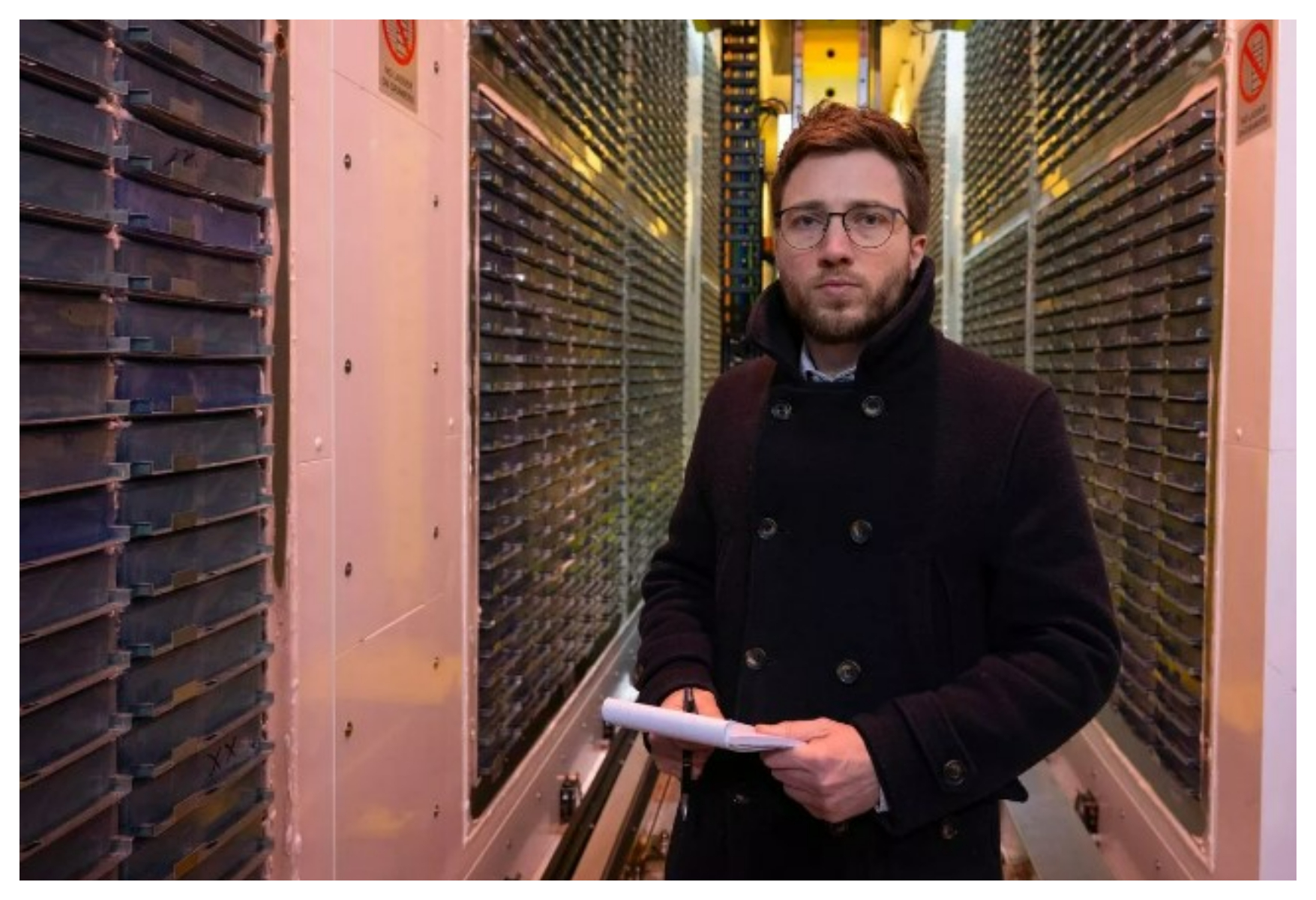Într-un congelator de mărimea a două autobuze cu etaj, un robot selectează fiolele.