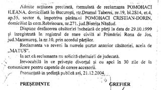 Cristian Pomohaci si Ileana Matus s-au casatorit pe 29.10.1999 la Primaria Rona de Jos, jud Maramures. Conform practicii judiciare, la solicitarea desfacerii casatoriei de comun acord, cei doi soti nu trebuie sa justifice in detaliu motivele pentru care cer (sau refuza) divortul. Hotararea a devenit definitiva si irevocabila pe 20.02.2005 datorita faptului ca nici una dintre parti nu a facut apel. (Citeste si: Stela Popescu ii ia apararea lui Pomohaci)