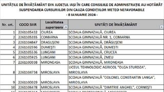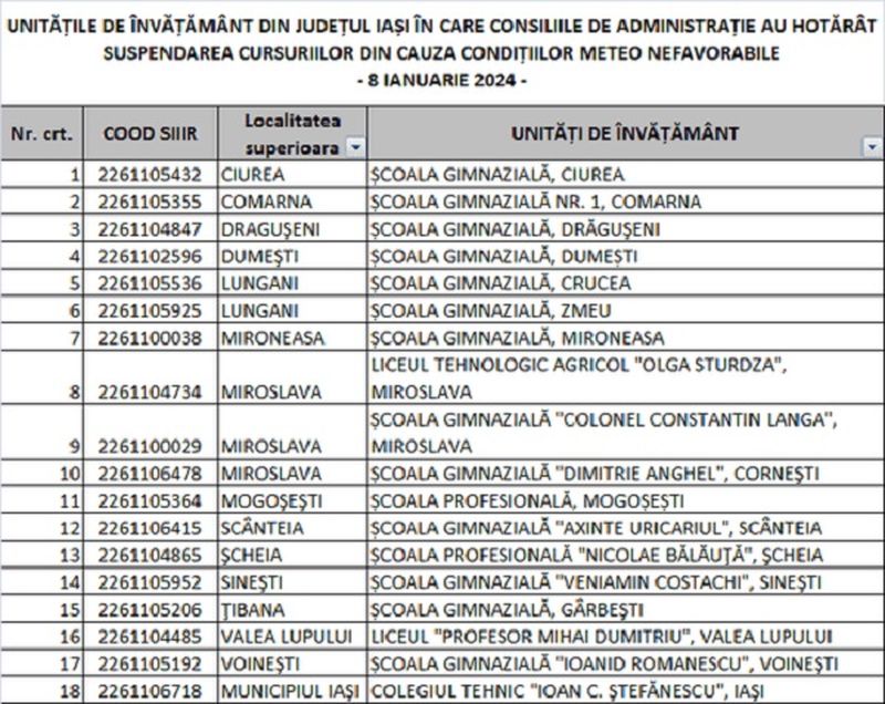 Prefectura Neamț a anunțat, luni după-masa, că următoarele școli din Neamț vor avea cursurile suspendate: