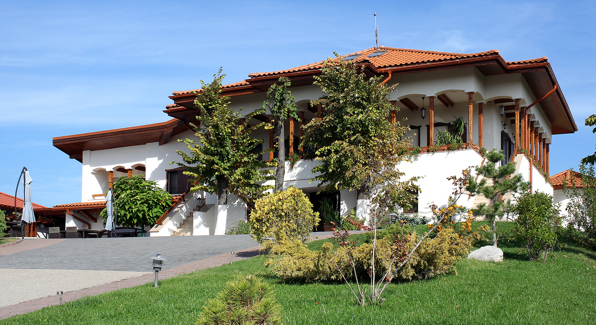 Cum arată sala de degustări de vin de la pensiunea lui Mugur Isărescu. În interior sunt trei mese întinse