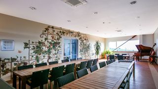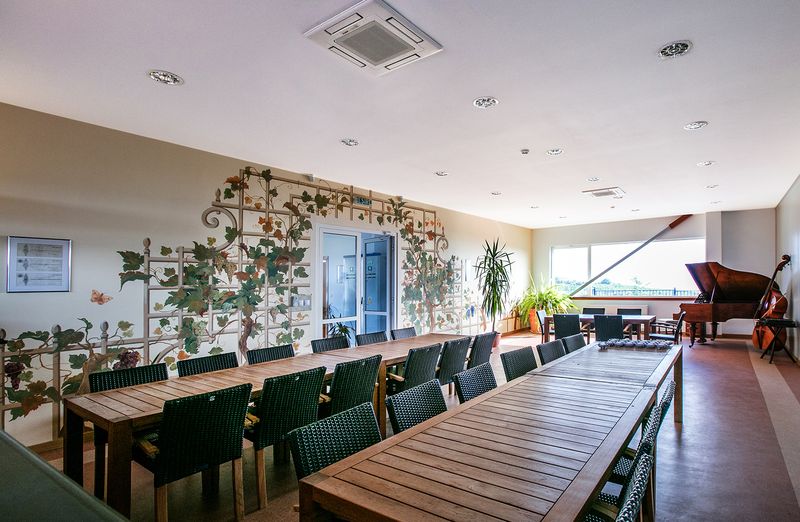 Câteva fotografii dezvăluie cum arată sala de degustări de vin de la pensiunea lui Mugur Isărescu. În interiorul acesteia se află două mese lungi, de câte 12 persoane, dar şi o masă mai mică, de 6 persoane, aflată lângă un pian şi un violoncel, amenajate într-un colţ al încăperii pentru concerte de muzică clasică care să întreţină atmosfera atunci când se degustă vinul.