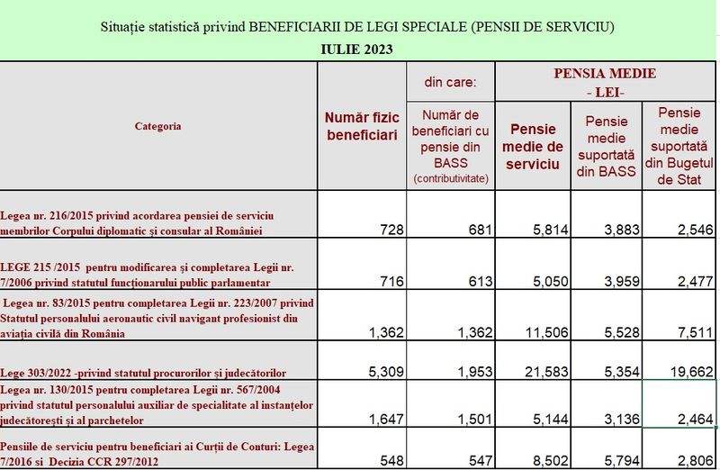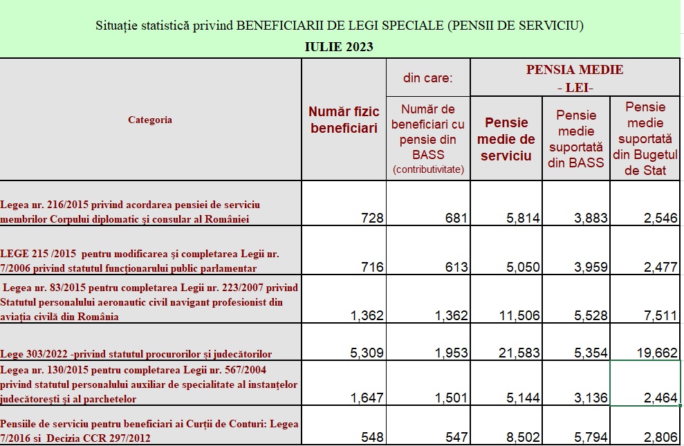 Numărul beneficiarilor de pensii de serviciu a fost, în iulie 2023, de 10.310 (cu 400 mai mulți decât la începutul anului), conform datelor centralizate de Casa Naţională de Pensii Publice (CNPP).