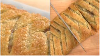 Ai nevoie de cateva mere pe care le tai feliute, peste care pui zahar brun, nuci, scortisoara si un strop de faina. Le amesteci si le intanzi pe foaia de placinta, chiar in mijloc. Faci „franjuri din aluatul de pe margine, apoi il impletesti, exact ca in videoclipul de mai jos.