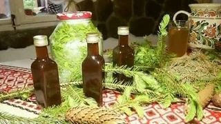 - Este sirop pastrat de anul trecut, avem muguri de brad uscati pentru ceai, muguri cruzi din care tocmai am facut siropul si sa gustam un pahar de sirop din cel de anul trecut.