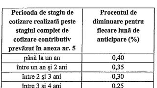 În legea actuală se prevede o reducere de 0,5% pentru fiecare luna până la 1 an, până la 0,25% până la 5 ani, iar în noua lege a pensiilor nouă penalizările sunt între 0,4 și 0,2%.