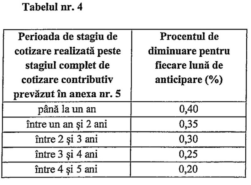 (3) Cuantumul pensiei anticipate se stabileşte prin diminuarea cuantumului pensiei pentru limită de vârstă, în raport cu stagiul de cotizare realizat peste stagiul complet de cotizare contributiv prevăzut în anexa nr. 5 şi cu numărul de luni cu care s-a redus vârsta standard de pensionare, conform tabelului nr. 4.