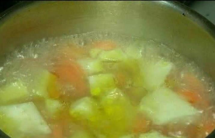 Cea de-a doua crema care va forma supa in doua culori se prepara la fel de usor: taiati cubulete telina, morcovi si ghimbir, adaugati putin ulei de masline si puneti totul la calit, cat sa se inmoaie un pic.