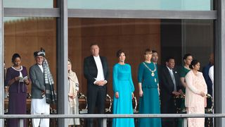 La ceremonia de la Palatul Imperial din Tokyo, Carmen Iohannnis a purtat o rochie lungă, din mătase turcoaz, iar șeful statului, un smoching cu papion alb.