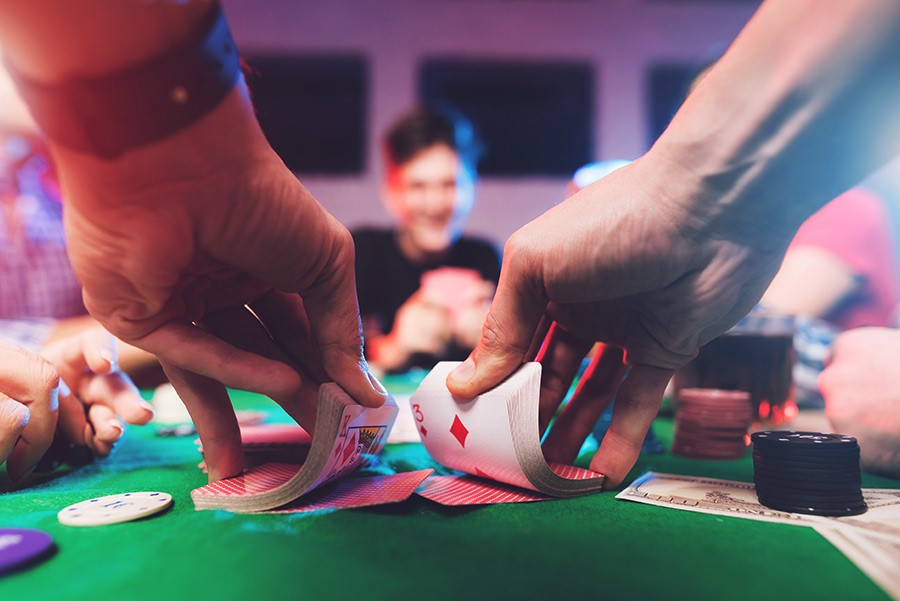 ● Amestecarea cărţilor, acţiune la care participă toţi jucători prezenţi la masa de joc. Cărţile se depun cu faţa în jos şi se amestecă energic