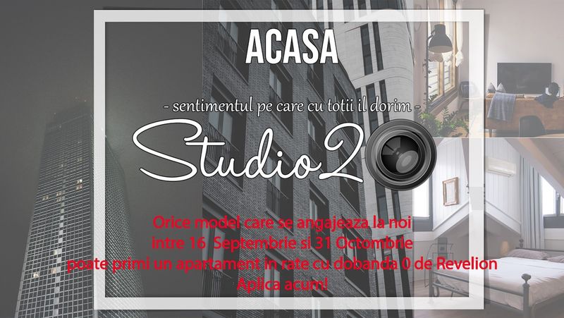 Orice model ce se angajeaza la Studio20 in perioada 16 septembrie si 31 octombrie poate primi apartamentul de mult visat in rate cu 0% dobanda chiar pe 1 ianuarie 2022!
