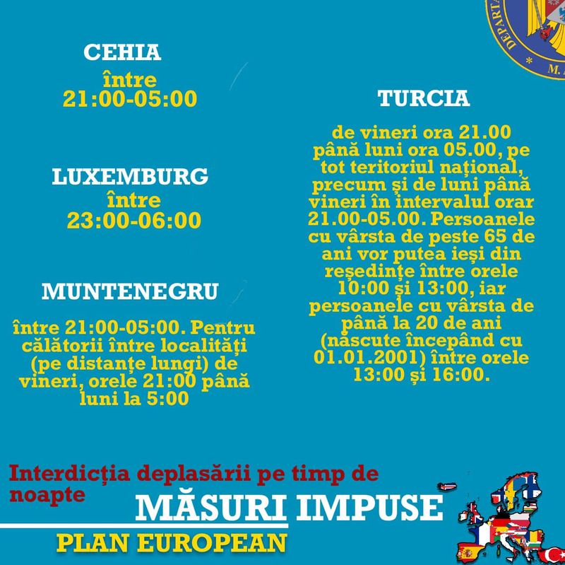 Departamentul pentru Situaţi de Urgenţă a prezentat o parte dintre restricțiile luate de mai multe state europene de reducere a mobilității intre anumite intervale orare, cu scopul de a limita răspândirea coronavirusului SARS-CoV-2 și a gestiona eficient criza sanitară actuală.