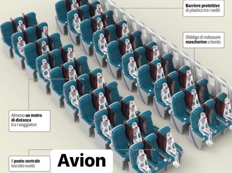 -în AVION se va monta plexiglas intre scaune si se va face asezarea pasagerilor astfel incat sa fie pastrata distranta de 1 m intre acestia. Purtarea mastilor va fi obligatorie