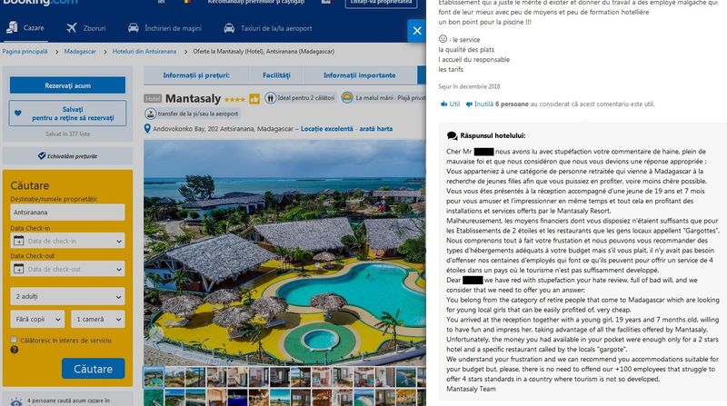 ”Domnule P, am citit cu stupefacție comentariul tău plin de ură și considerăm că trebuie să vă oferim un răspuns: tu faci parte din categoria de oameni care vin în Madagscar în căutare de fete tinere de care să poți profita și care sunt foarte ieftine.