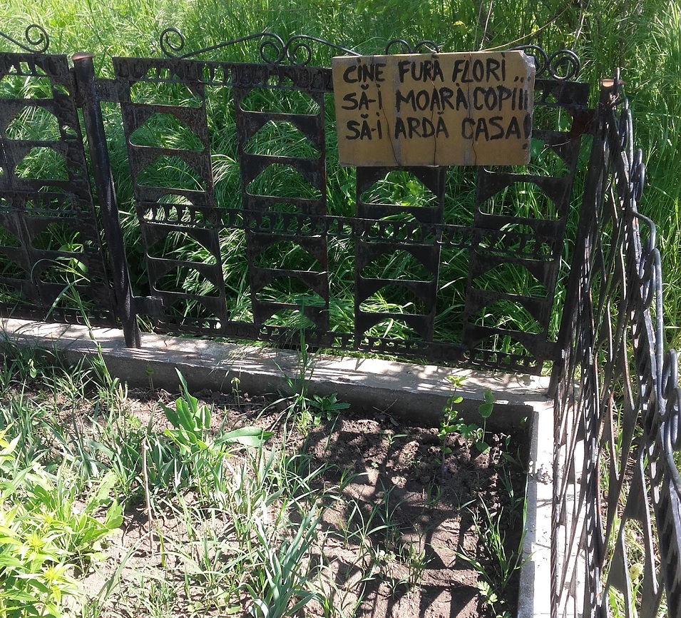 La un mormant, pe gardul care-l delimiteaza, pe o bucata de carton, scrie cu majuscule un mesaj care pare a fi mai mult un blestem decat o atentionare pentru cei care rup flori de pe morminte: “Cine fura flori… sa-i moara copiii, sa-i arda casa!!!”
