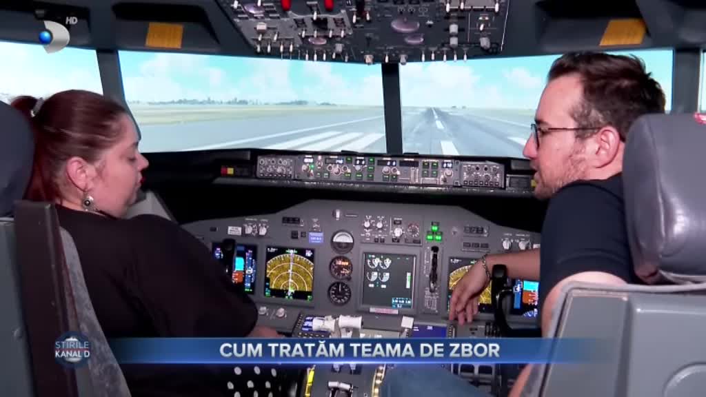 În fața panoului de comandă al simulatorului de zbor, sub coordonarea instructorului, Maria pare că se relaxează.