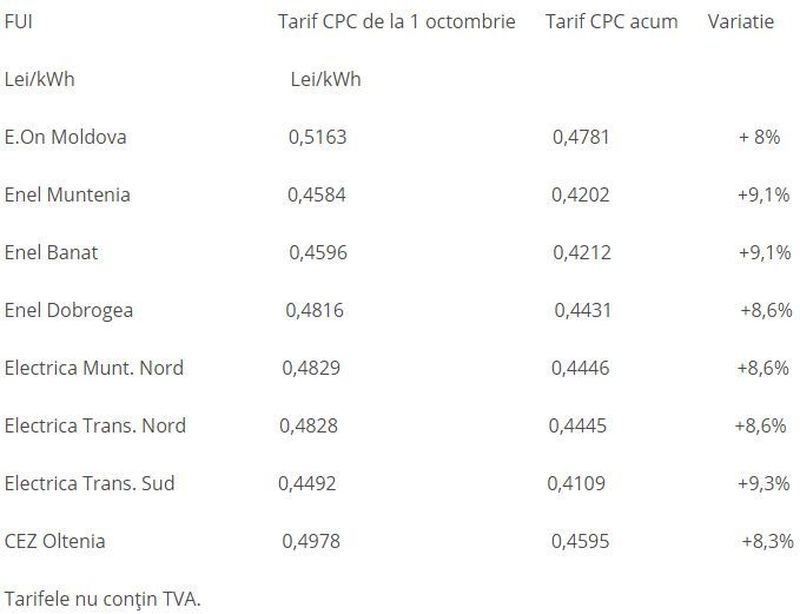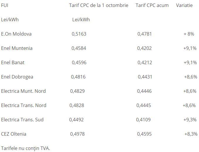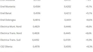 Iata, detaliat, noile tarife CPC si procentul de crestere pentru fiecare furnizor de ultima instanta (FUI), pentru fiecare zona din Romania: