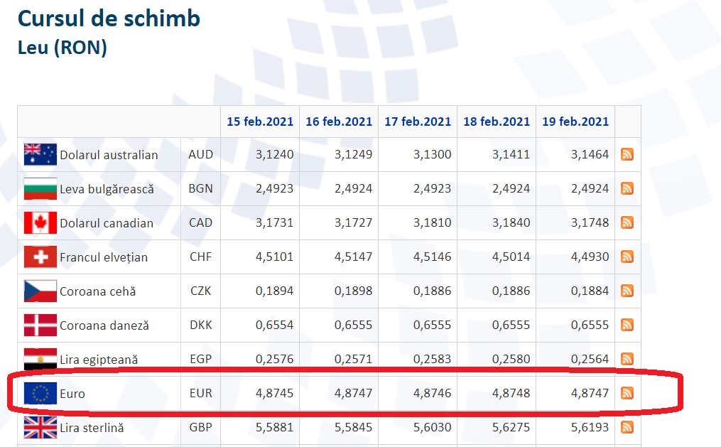 Curs valutar BNR, azi 19 februarie. Banca Națională a anunțat și vineri un curs oficial în stagnare pentru euro. De fapt, toată săptămâna cursul euro-leu a fost înghețat la valoarea de 4,8745-48 lei, după cum se poate vedea în imaginea de mai jos: