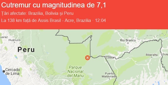 Un seism cu magnitudinea 7,1 s-a produs la aproximativ 250 de kilometri nord-vest de orasul Puerto Maldonado din sud-estul Peru, informeaza vineri Reuters.