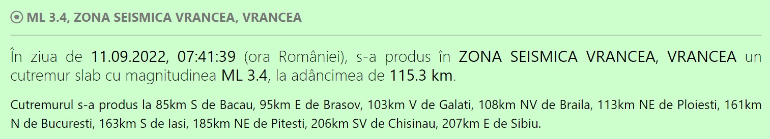 Tot duminică dimineață, la ora 07:41, un alt seism a avut loc în zona Vrancea, intensitatea lui fiind de 3,4 pe Richter, la o adâncime de 115, 3 km.