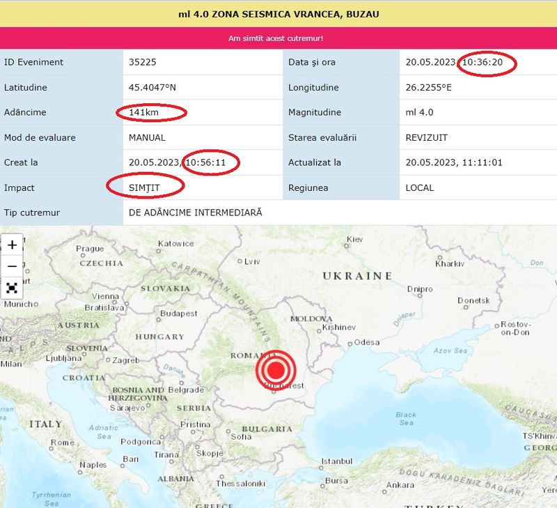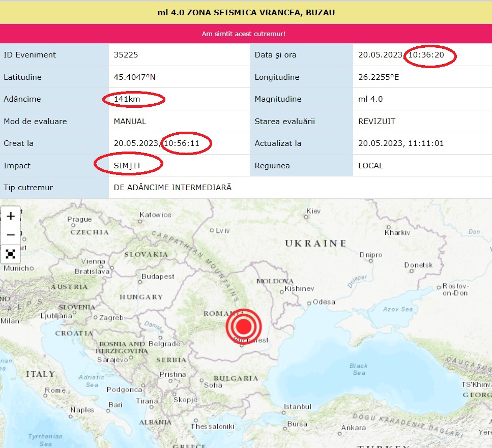 Seismul s-a produs la 53km N de Ploiesti, 55km SE de Brasov, 55km NV de Buzau, 61km SE de Sfantu-Gheorghe, 80km NE de Targoviste, 81km SV de Focsani.