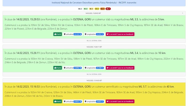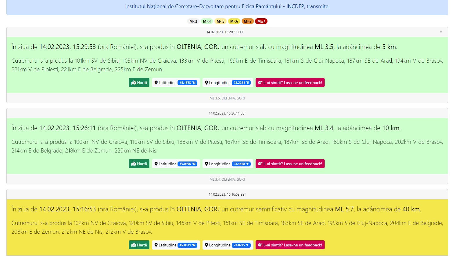 ”În ziua de 13.02.2023, 16:58:06 (ora României), s-a produs în OLTENIA, GORJ un cutremur semnificativ cu magnitudinea ML 5.2, la adâncimea de 15 km”, a transmis INFP.