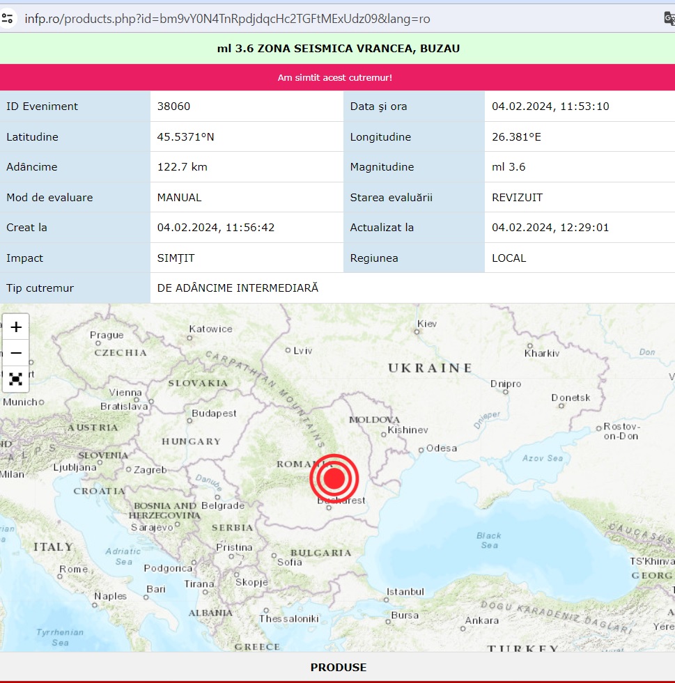 Institutul de Fizica Pământului a transmis că seismul a avut loc în ziua de 04 februarie 2024, la ora 11:53:10 (ora locală a României), în ZONA SEISMICA VRANCEA, BUZAU.