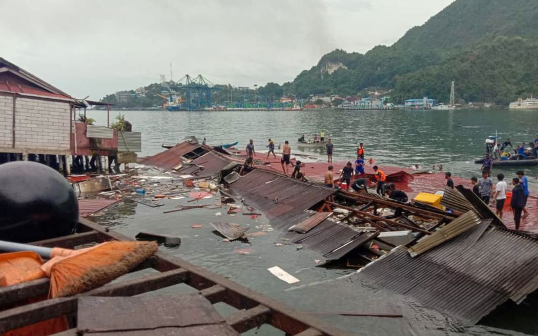 Cutremurul de mică adâncime a făcut ca o cafenea situată pe un doc din North Jayapura să se prăbușească și să cadă în apă, ucigând astfel patru femei.