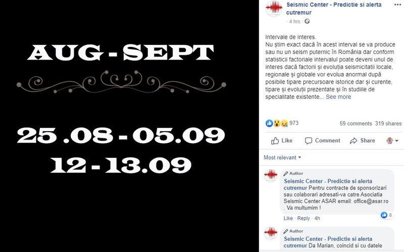(...) Intervalele publicate mai sus nu reprezintă data producerii unui cutremur dar reprezintă o statistică privind creșterea activității seismice ce poate avea ca rezultat intensificarea magnitudinii regionale, atât știm în acest moment și asta v-am comunicat. Bineînțeles că se pot extrage mai multe informații până atunci dacă va exista un interes și sprijin. Noi am încercat, dar nu depinde numai de noi.