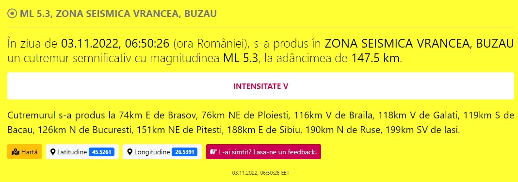 "În ziua de 03.11.2022, 06:50:26 (ora României), s-a produs în ZONA SEISMICA VRANCEA, BUZAU un cutremur semnificativ cu magnitudinea ML 5.3, la adâncimea de 147.5 km", a transmis INFP.