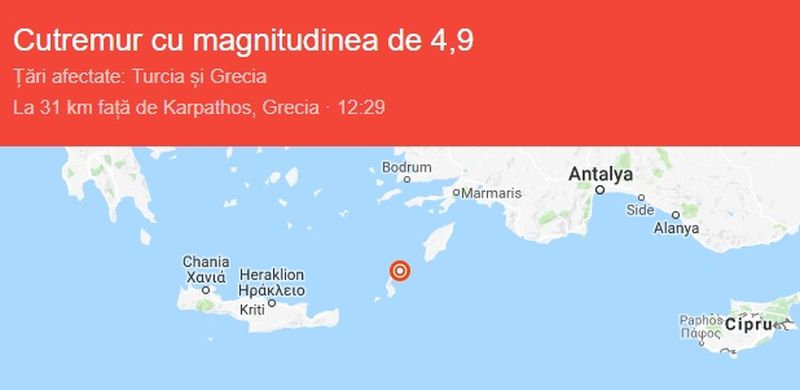 Cutremur cu magnitudine 4.8 în Grecia. Potrivit USGS, seismul s-a produs la o adâncime de 40 de kilometri, la circa 100 de kilometri de Rhodos. Cutremurul a fost resimţit şi în Turcia, la Izmir.