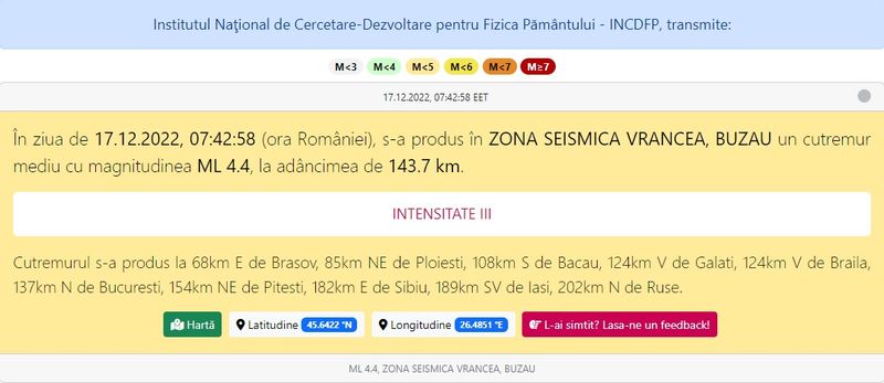 În ziua de 16.12.2022, 01:47:13 (ora României), s-a produs în ZONA SEISMICA VRANCEA, VRANCEA un cutremur mediu cu magnitudinea ML 4.1
