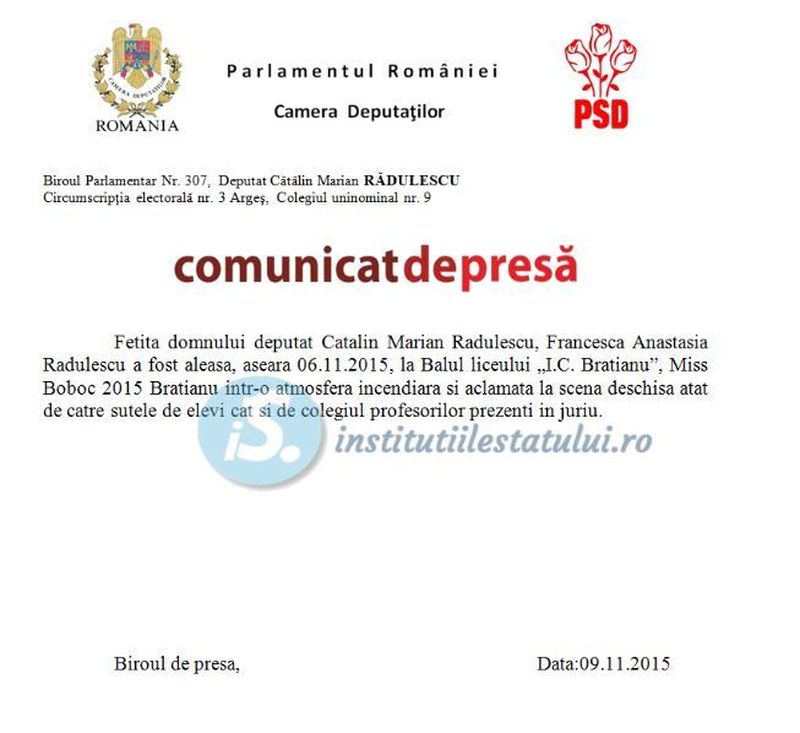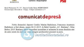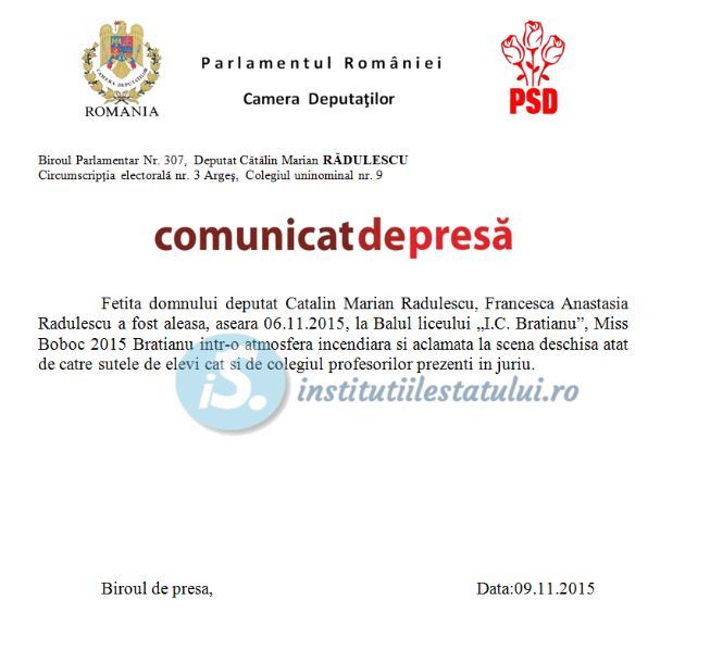 „Fetita domnului deputat Catalin Marian Radulescu, Francesca Anastasia Radulescu, a fost aleasa aseara, 06.11.2015, la Balul liceului IC Bratianu, Miss Boboc 2015 Bratianu, intr-o atmosfera incendiara si aclamata la scena deschisa atat de catre sutele de elevi cat si de colegiul profesorilor prezenti in juriu”, se arata in comunicat.