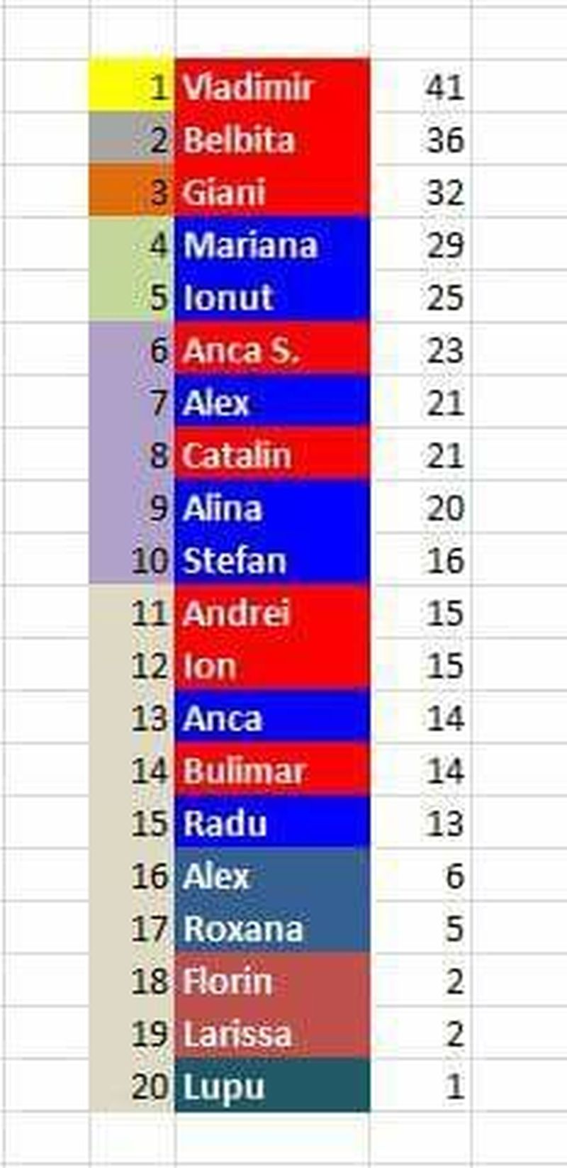 Cei mai buni din "lotul" Razboinicilor sunt Mariana si Ionut care au 29, respectiv 25 de puncte si care ocupa pozitiile 4 si 5.
