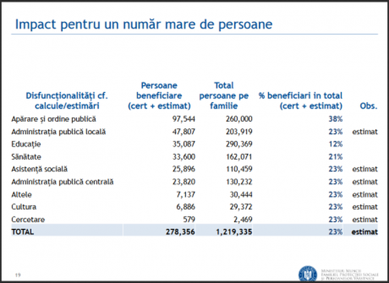 Problema este ca doar un sfert din persoanele angajate in sectorul bugetar vor beneficia de aceste cresteri salariale, fiind vorba de sectoare precum educatie, sanatate, asistenta sociala, administratie publica centrala, cultura, cercetare, administratie publica locala si aparare si ordine publica.