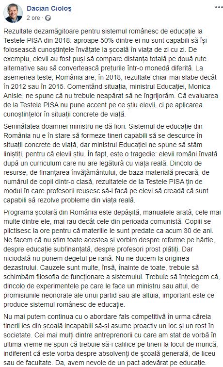 Liderul USR, Dacian Cioloș a postat pe contul său de socializare în urmă cu două ore un mesaj în care se arată dezamăgit de rezultatul testelor PISA care arată capacitatea intelectuală a elevilor români.