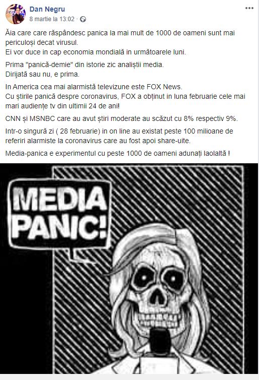 Prezentatorul TV apare în poză purtând o mască chirurgicală care are desenat un creier, iar în spatele său se află o bibliotecă, pe semne că oamenii nu gândesc în această perioadă și se isterizează după ce citesc știrile din mass media.