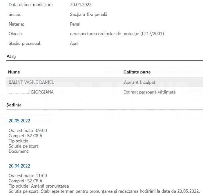 În cadrul dosarului de apel, în care a contestat condamnarea la trei ani și șapte luni, cu executare, Daniel Vasile Balint, alias Dani Cămătaru, le-a cerut judecătorilor să anuleze ordinul de protecție din cauza căruia a primit pedeapsa. Magistraților nu le-a venit să creadă și i-au explicat condamnatului că fix aia judecă ei în procesul respectiv, așa că nu au cum să anuleze „obiectul cauzei”. „Califică cererea formulată de inculpatul B.V.D., de anulare a ordinului de protecţie provizoriu nr. XXXX emis la data de 18.02.2021, de către XXXX, ca reprezentând o cerere ce vizează fondul acuzaţiei, care va fi analizată cu ocazia deliberării asupra apelului declarat de acesta”, au
