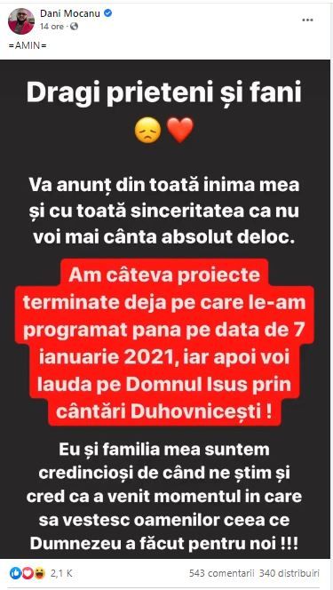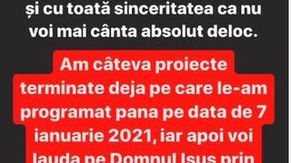 ”Dragi prieteni și fani, vă anunț din toată inima mea și cu toată sinceritatea că nu voi mai cânta absolut deloc. Am câteva proiecte terminate deja pe care le-am programat până pe data de 7 ianuarie 2021, iar apoi voi lăuda pe Domnul Isus prin cântări Duhovnicești!