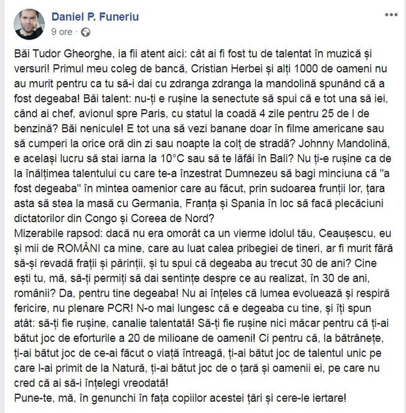 Mesajul lui Daniel Funeriu, postat pe pagina sa de socializare a strâns în câteva ore, mii de aprecieri și sute de mesaje.